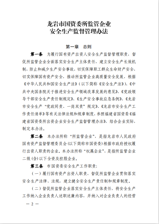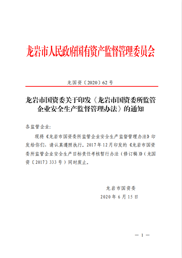 龙岩市国资委关于印发《龙岩市����� �������Ƴ������������ �������Ƴ������������ �������Ƴ������������ �������Ƴ�������国资委所监管企业安全生产监督管理办法》的通知(����� �������Ƴ������������ �������Ƴ����������� �������Ƴ������������ �������Ƴ�������龙国资[2020]62号)